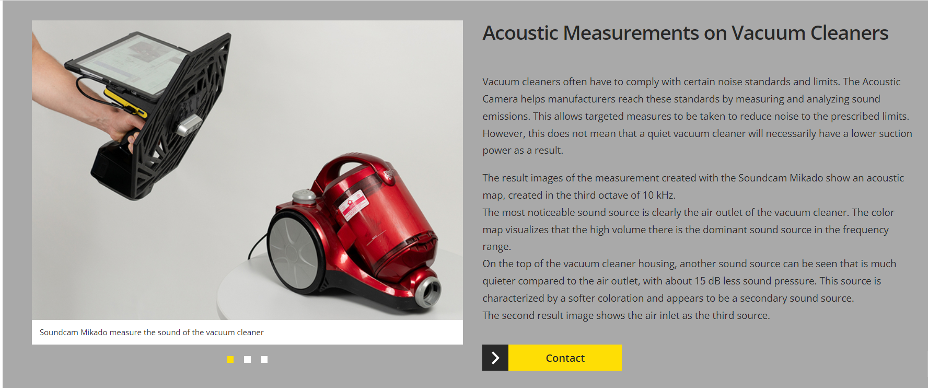 In product development, the Acoustic Camera also helps to ensure that the next generation of household and leisure appliances has a first-class sound design. This improves the customer experience and increases the appeal of the products. Acoustic maps help identify where manufacturers need to target to reduce sound emissions from appliances, machinery and equipment and comply with regulatory limits. The areas of application are as diverse as the products themselves: Mobile or stationary, small or large – sound measurements can be carried out on a wide variety of equipment.