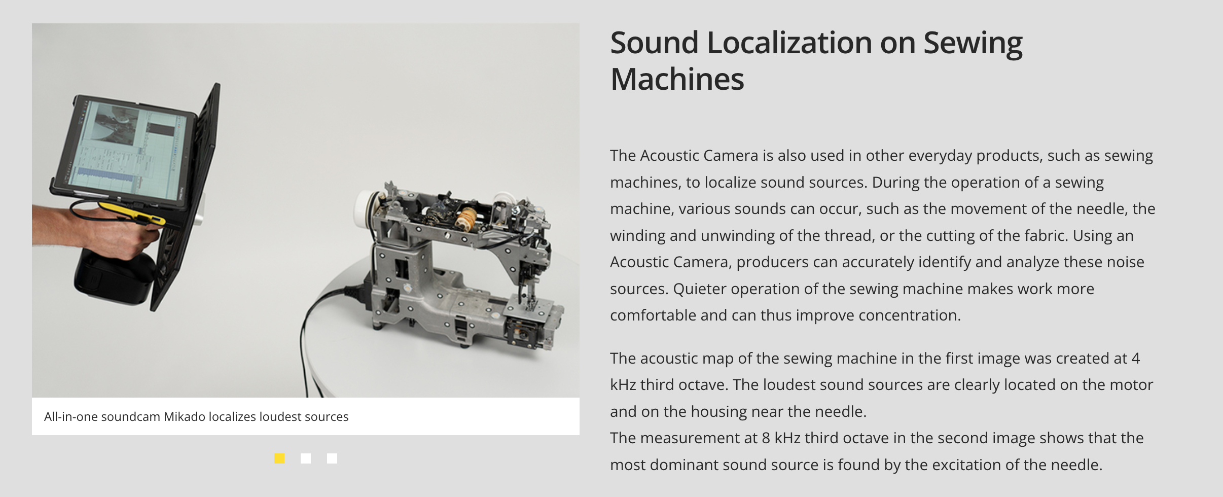 Acoustic measurement methods are therefore used both in the development phase and in the maintenance and servicing of devices and equipment, and vibration analyses are carried out to localize noises and optimize products.
